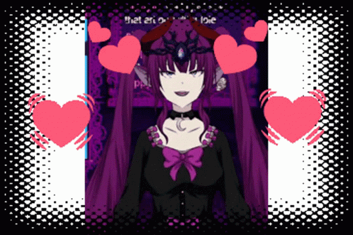 Opis sadržaja: a girl with purple hair is surrounded by pink hearts and a purple background that says that an o love