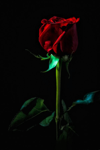 Opis sadržaja: a single red rose with green leaves is against a black background
