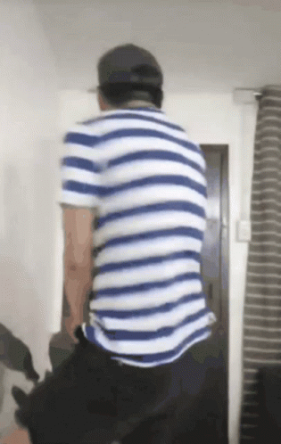 Opis sadržaja: a man in a blue and white striped shirt is standing in a room