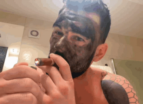 Opis sadržaja: a man with a beard and a black mask on his face smoking a cigar