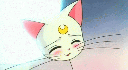 Opis sadržaja: a cat with a crescent moon on its head is smiling .