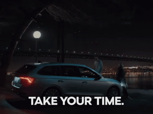 Opis sadržaja: a woman standing next to a car with the words take your time