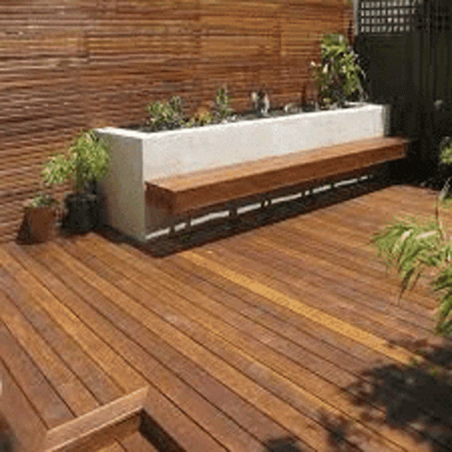 Opis sadržaja: a wooden deck with a bench and a potted plant .
