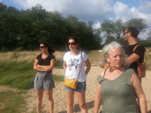 Opis sadržaja: a group of people standing on a sandy beach with one woman wearing a white shirt with a turtle on it