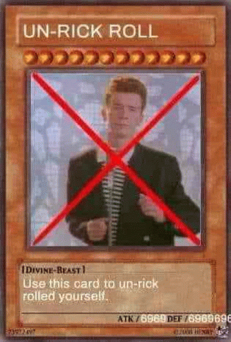 Opis sadržaja: a card that says `` un-rick roll '' with a picture of rick roll crossed out .