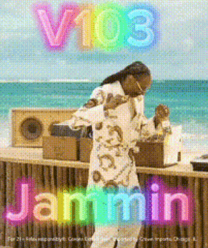 Opis sadržaja: a poster of a man dancing on the beach with the words v103 jammin on it