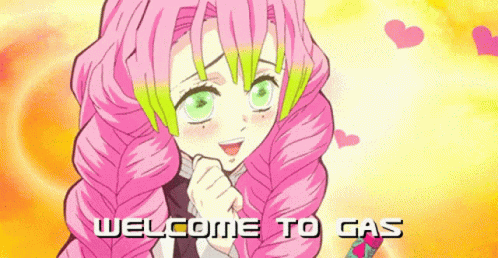 Opis sadržaja: a girl with pink hair and green eyes says welcome to gas