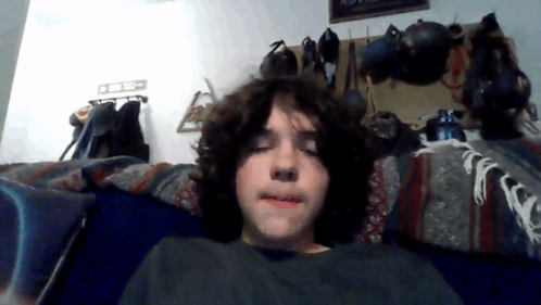 Opis sadržaja: a young boy with curly hair is laying on a couch with his eyes closed