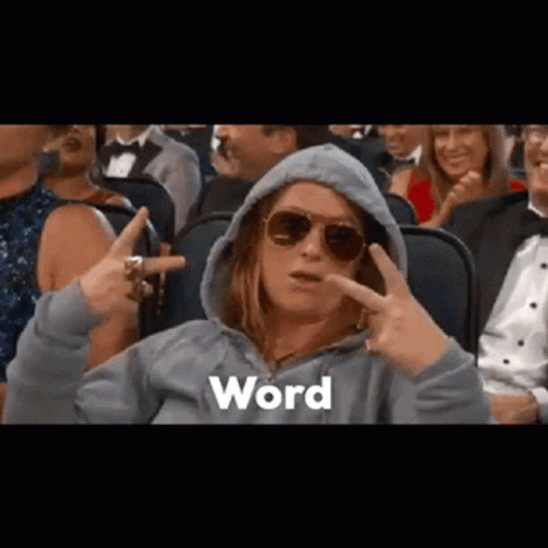 Opis sadržaja: a woman wearing a hoodie and sunglasses is sitting in a crowd of people and pointing at the word word .