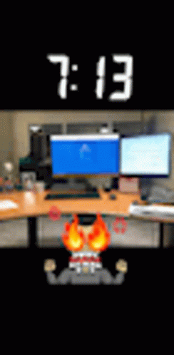 Opis sadržaja: a blurred image of a desk with two computer monitors and a fire coming out of it .