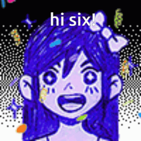 Opis sadržaja: a cartoon girl with blue hair and a bow in her hair is smiling and saying hi six .