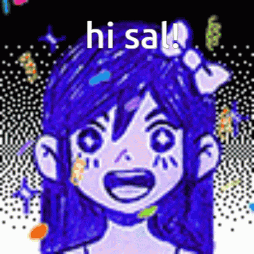 Opis sadržaja: a cartoon girl with blue hair and a bow in her hair is smiling and says hi sal !