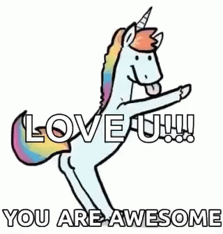Opis sadržaja: a cartoon unicorn is standing on its hind legs with its tongue out and says `` love u ! you are awesome '' .