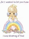 Опис садржаја: a precious moments angel is sitting on top of a rainbow with flowers .