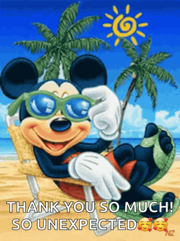 Опис садржаја: mickey mouse wearing sunglasses is laying in a chair on the beach and says thank you so much so unexpected