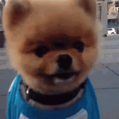 Опис садржаја: a pomeranian dog wearing a blue sweater is smiling for the camera .