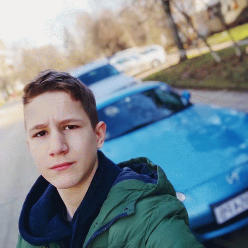 Опис садржаја: a young man in a green jacket is taking a selfie in front of a blue car