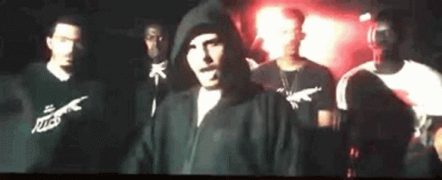 Опис садржаја: a group of men are standing in a dark room and one of them is wearing a hoodie .