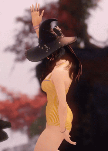 Опис садржаја: a woman in a yellow striped swimsuit and a black witch hat