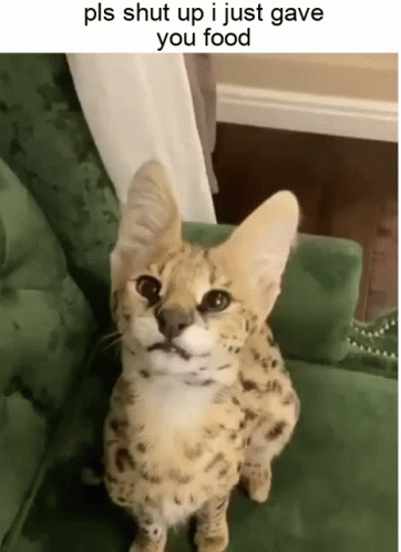 Опис садржаја: a cat sitting on a green couch with the caption " pls shut up i just gave you food " on the bottom