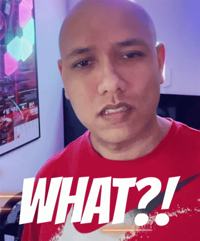 Innehållsbeskrivning: a bald man is wearing a red shirt that says what
