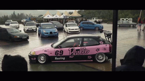 Innehållsbeskrivning: a pink barbie car with the number 69 on the side