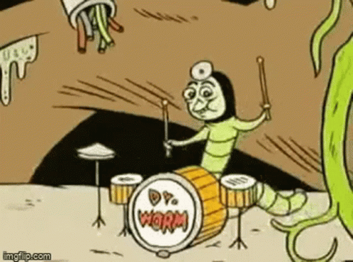 Maelezo ya Maudhui: a cartoon of a worm playing drums with a drum set .
