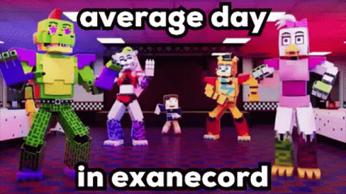 Maelezo ya Maudhui: a group of robots are dancing in a room with the words `` average day in examcord '' written on it .