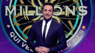 Maelezo ya Maudhui: a man in a suit and tie is standing in front of a sign that says " millions "