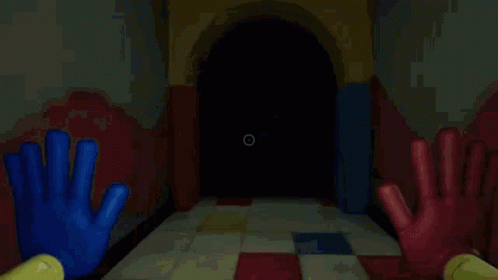 Maelezo ya Maudhui: a blue hand and a red hand are reaching out towards a monster in a hallway