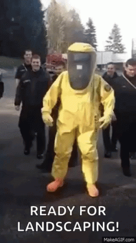 Opis treści: a man in a yellow hazmat suit is walking with a group of people .
