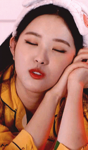 Opis treści: a woman with her eyes closed wearing a yellow shirt and a white headband