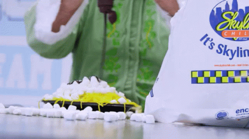 Descrição do conteúdo: a bag of skyline chili sits on a table next to a person