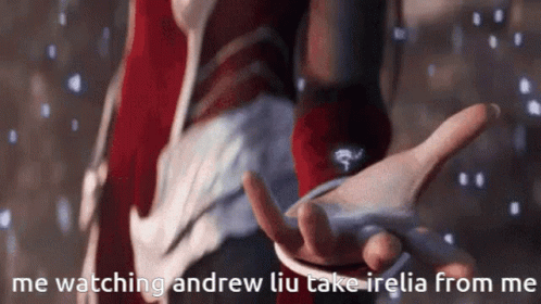 a close up of a person 's hand with the text me watching andrew liu take irelia from me