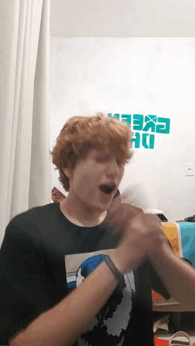 Descrierea conținutului: a young man with red hair is standing in front of a wall that says excel