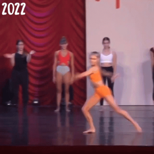 Descrierea conținutului: a girl in an orange outfit is dancing on a stage with the year 2022