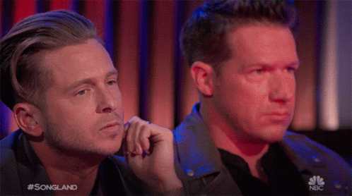 Descrierea conținutului: two men sitting next to each other with the words songland on the bottom right