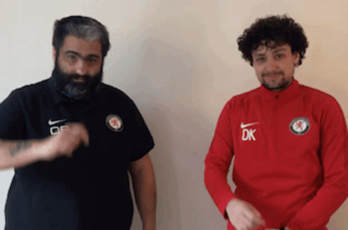 Descrierea conținutului: two men standing next to each other one of whom is wearing a red jacket with dk on it