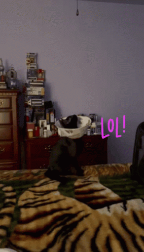 Descrierea conținutului: a cat with a cone on its head is sitting on a bed with lol written on the wall