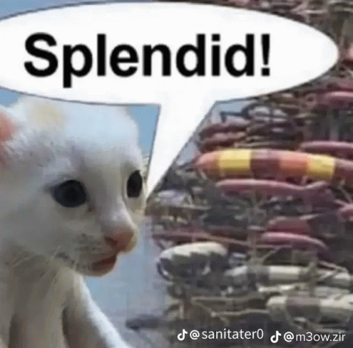 Descrierea conținutului: a white cat is talking with a speech bubble that says splendid !