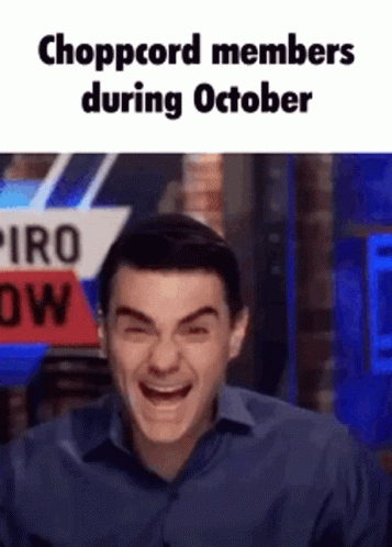 Descrierea conținutului: a man in a blue shirt is laughing in front of a sign that says chopcord members during october .