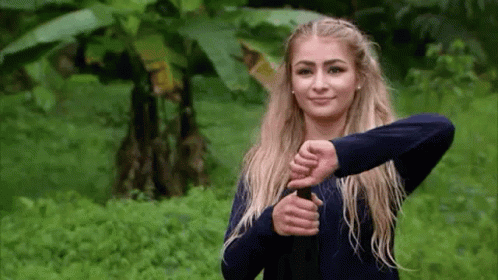 Descrierea conținutului: a woman is giving a thumbs down sign while standing in the jungle .