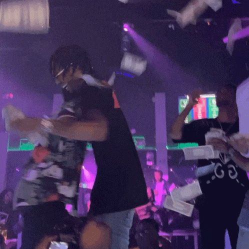 Descrierea conținutului: a group of people dancing in a club with purple lights