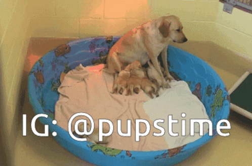 Descrierea conținutului: a dog is nursing her puppies in a pool with the hashtag @pupstime on the bottom