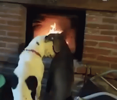 Descrierea conținutului: a dog and a cat are looking into a fireplace with flames coming out of it