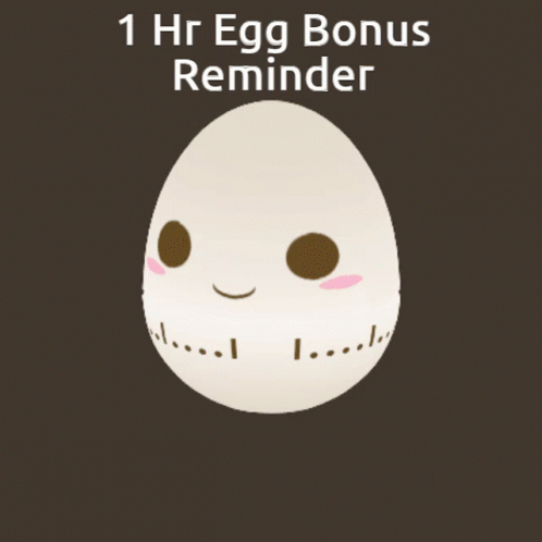 Descrierea conținutului: a white egg with a face on it and the words 1 hr egg bonus reminder below it