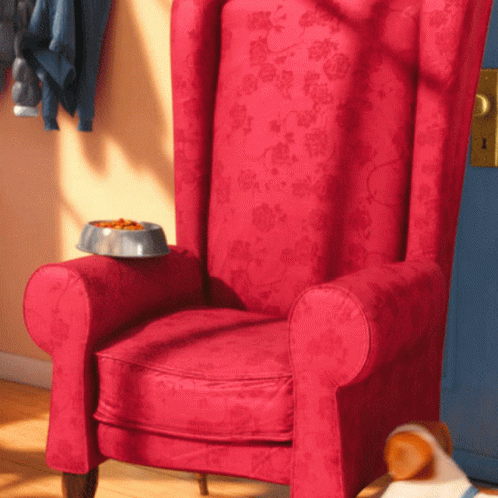 Descrierea conținutului: a red chair with a bowl of dog food on it