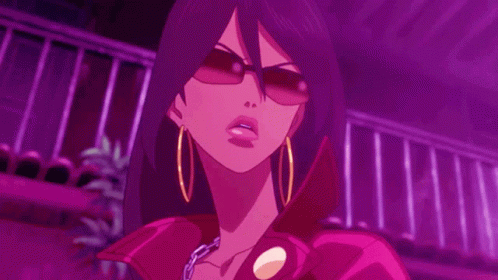 Descrierea conținutului: a cartoon girl wearing sunglasses and a pink jacket is making a funny face