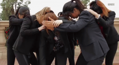 Descrierea conținutului: a group of women standing in a huddle with their arms around each other