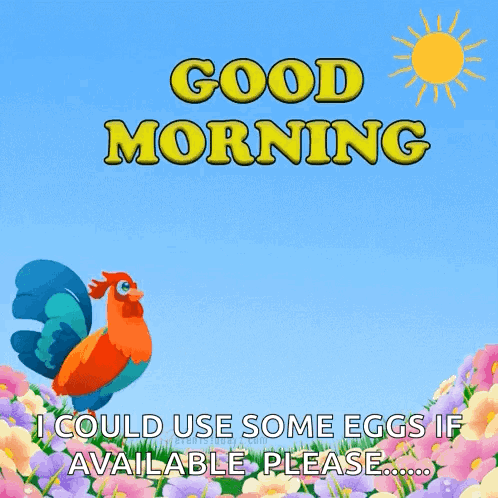Descrierea conținutului: a rooster standing in a field of flowers with the words good morning